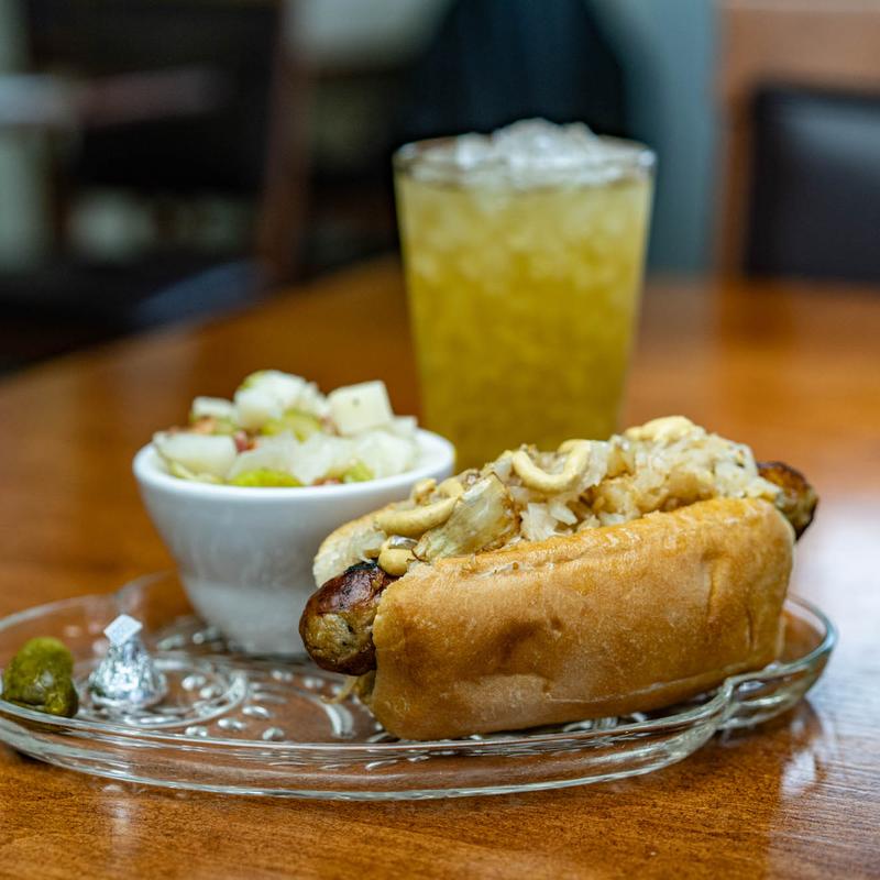 Garnish choices: Sauerkraut, Grilled Onions, Cheddar, Mustard, Spicy Brown, Dijon, German or Yellow